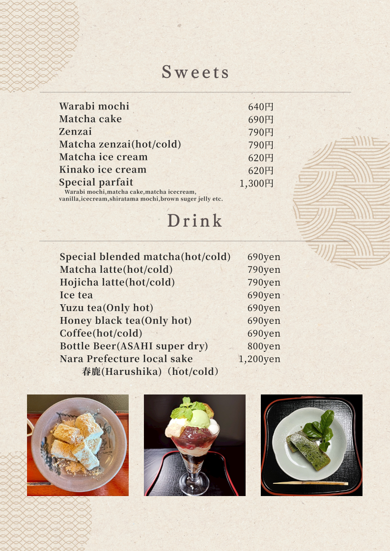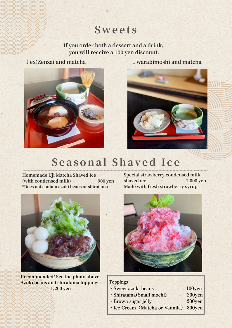 But don’t stop there; the cafe is a dessert lover's paradise. Treat yourself to a selection of handcrafted sweets such as the Warabi Mochi (JP¥640) and the decadent Matcha Cake (JP¥690), each offering a delightful experience that beautifully complements a warm cup of authentic matcha. If you’re looking for something refreshing, the Special Parfait, adorned with warabi mochi, matcha cake, and ice cream, is a must-try at JP¥1,300. And for those sweltering Nara days, the Homemade Uji Matcha Shaved Ice (JP¥900) promises a delectable cooling treat.